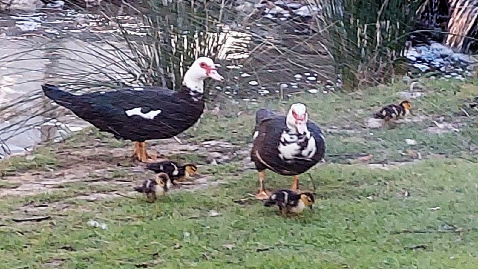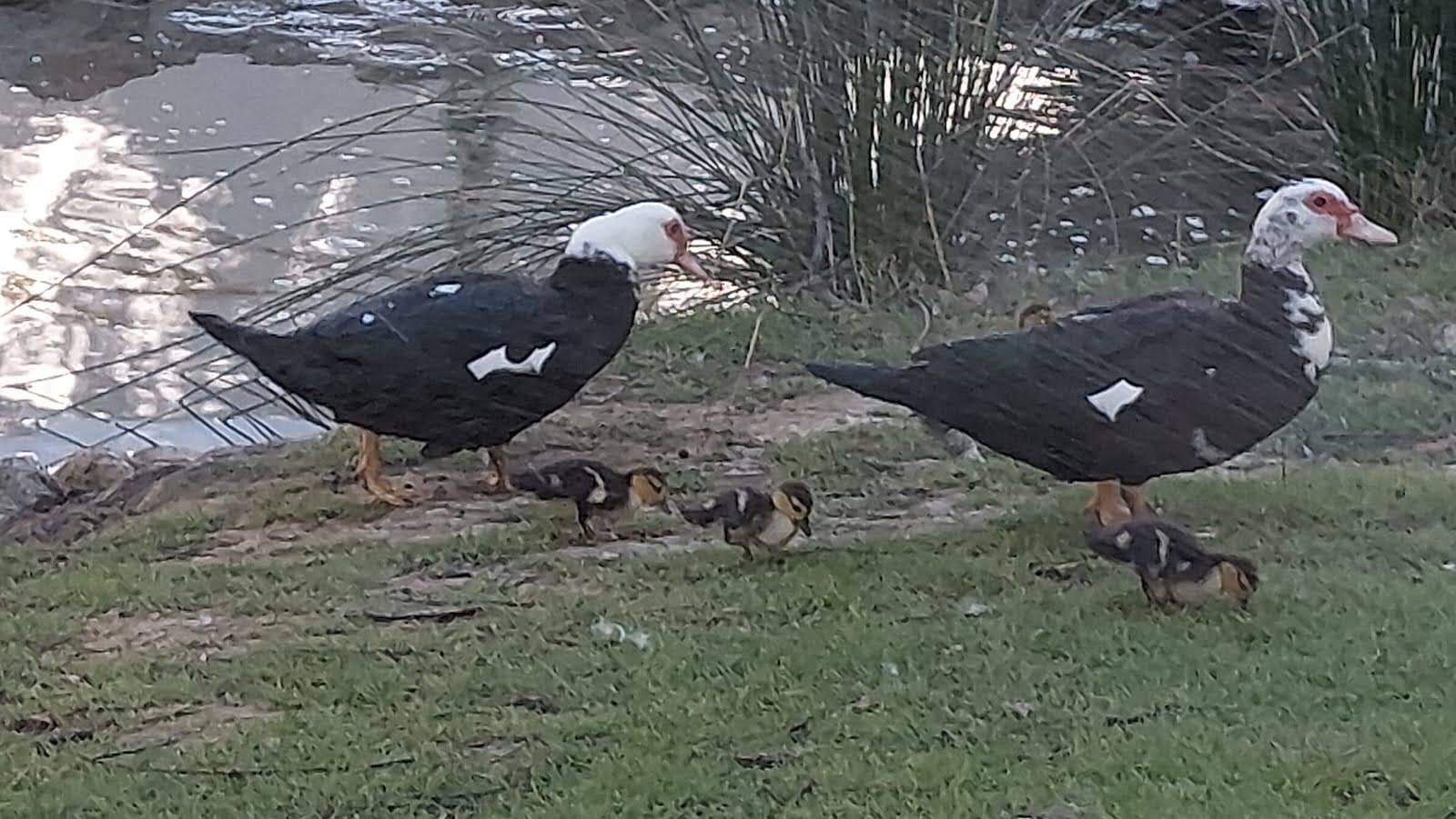 Estos sonidos apacibles quedan a veces interrumpidos por las señales de aviso, suaves pero estridentes, con las que las parejas de pato criollo, también llamado pato mudo, mantienen agrupados a sus pequeños.